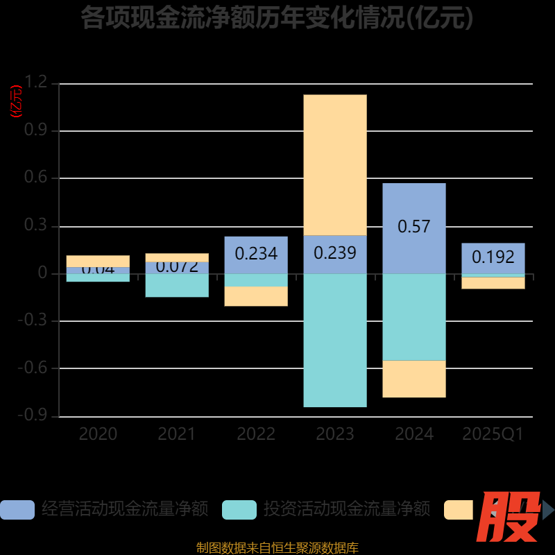 截至2025年一季度末,公司经营活动现金流净额为1915.74万元,同比下降51.45%;筹资活动现金流净额-738.3万元,同比减少1090.99万元;投资活动现金流净额-228.29万元,上年同期为-6230.07万元。