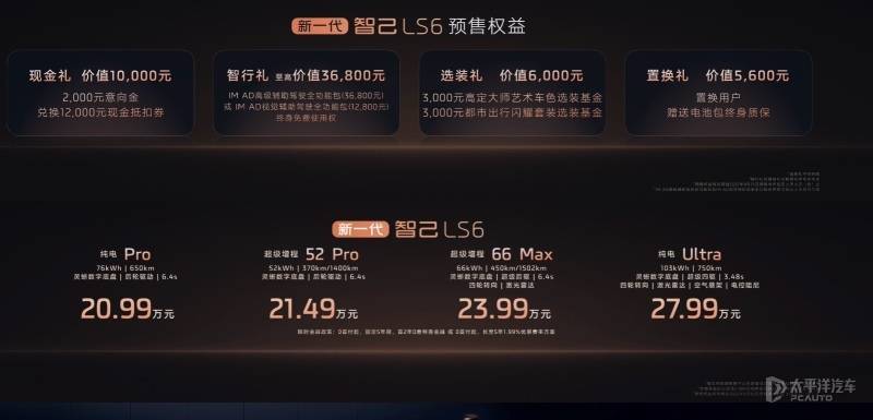 全新智己LS6权益预售价 车型 预售价(万元)纯电Pro 20.99 纯电Ultra27.99 超级增程52 Pro 21.49超级增程66 Max 23.99